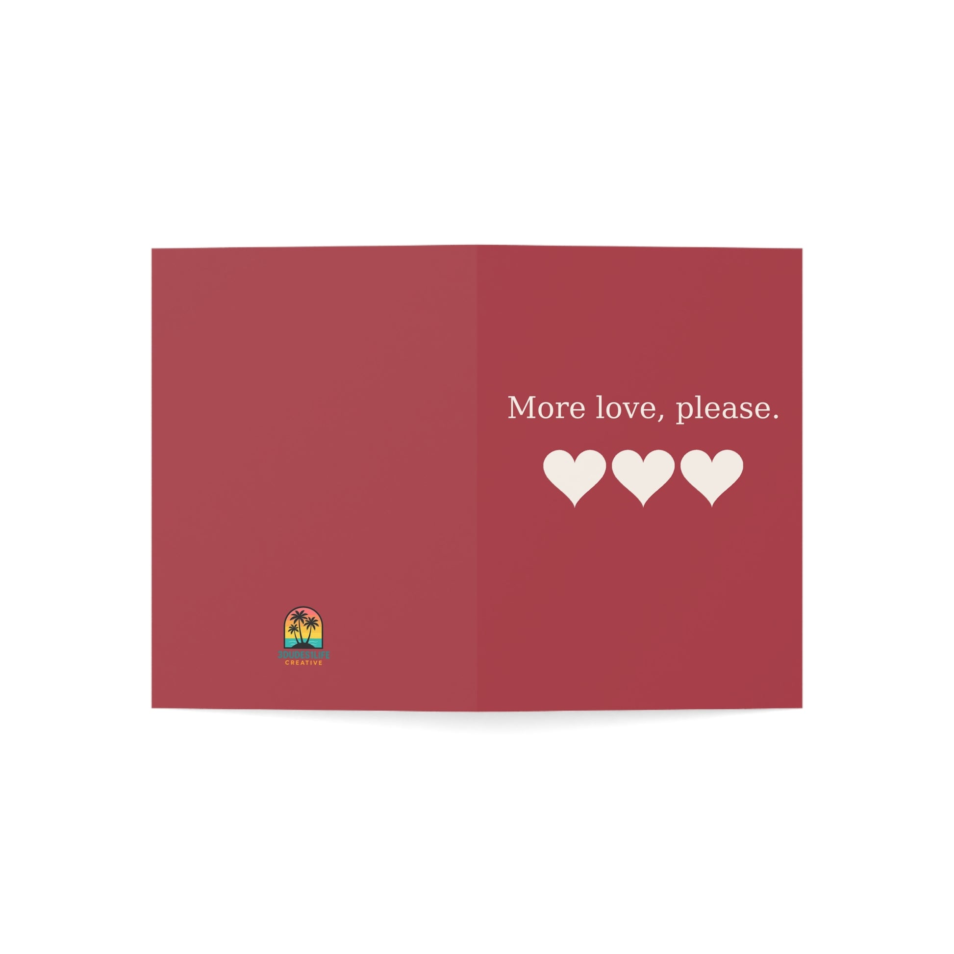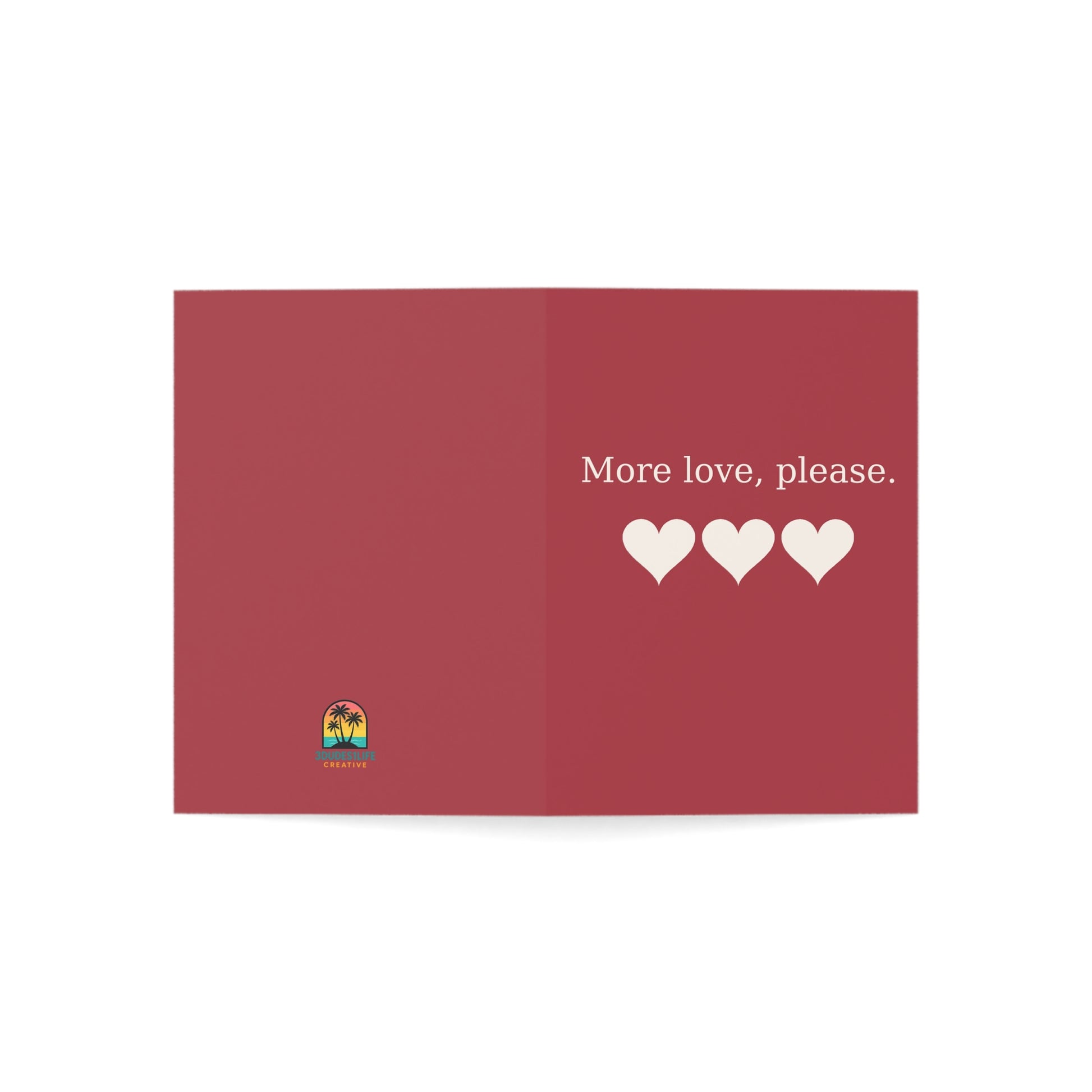 A warm Throuple Valentine's Day Card, heartfelt greeting card printed on heavy 270gsm paper, this folded card greets loved ones with a simple plea—“More love, please.”—and three soft heart icons on a deep, comforting crimson background. The design feels like a quiet, sincere moment: gentle typography and minimalist graphics that let your message shine. The back features a subtle brand mark for a polished finish. Choose from multiple sizes, finishes, and orientations to match the tone you want—matte or satin-like coated surfaces keep colors vivid and text crisp. Each card ships with a matching envelope and is sourced and printed in the USA, ready to send warmth and intention when words matter most.