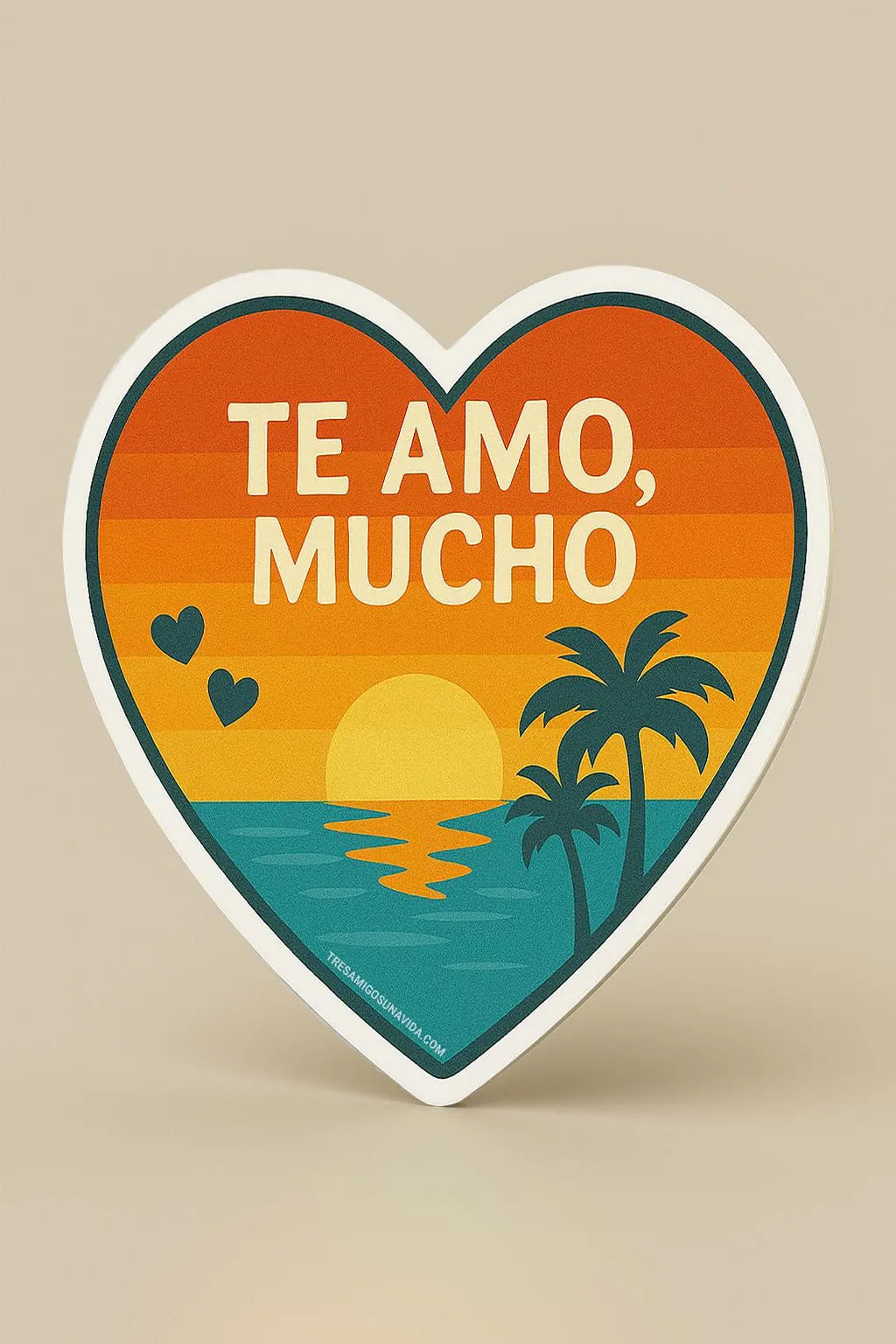 This bold 3-inch vinyl heart sticker is perfect for anyone who leads with love — especially the kind that says mucho. With a romantic beach sunset and vibrant retro colors, this sticker is waterproof, fade-proof, and guaranteed to bring a little cariño wherever it goes.